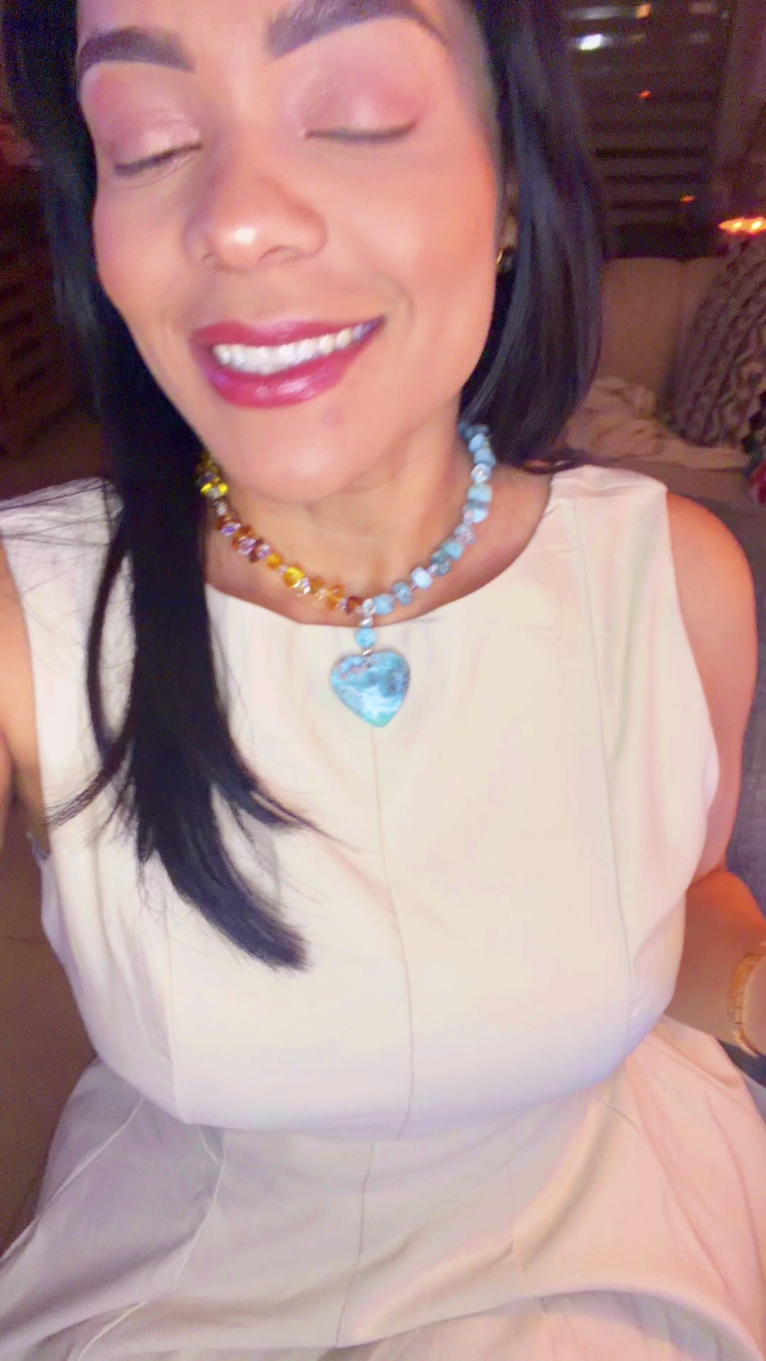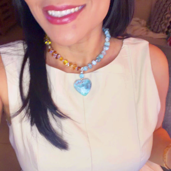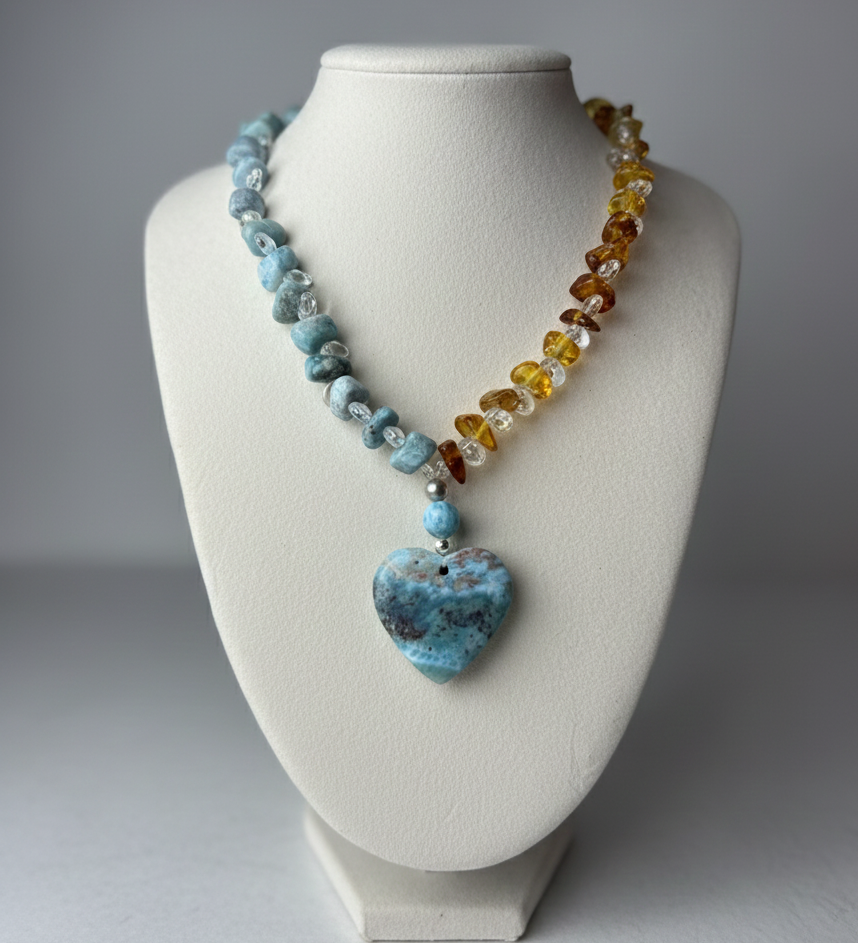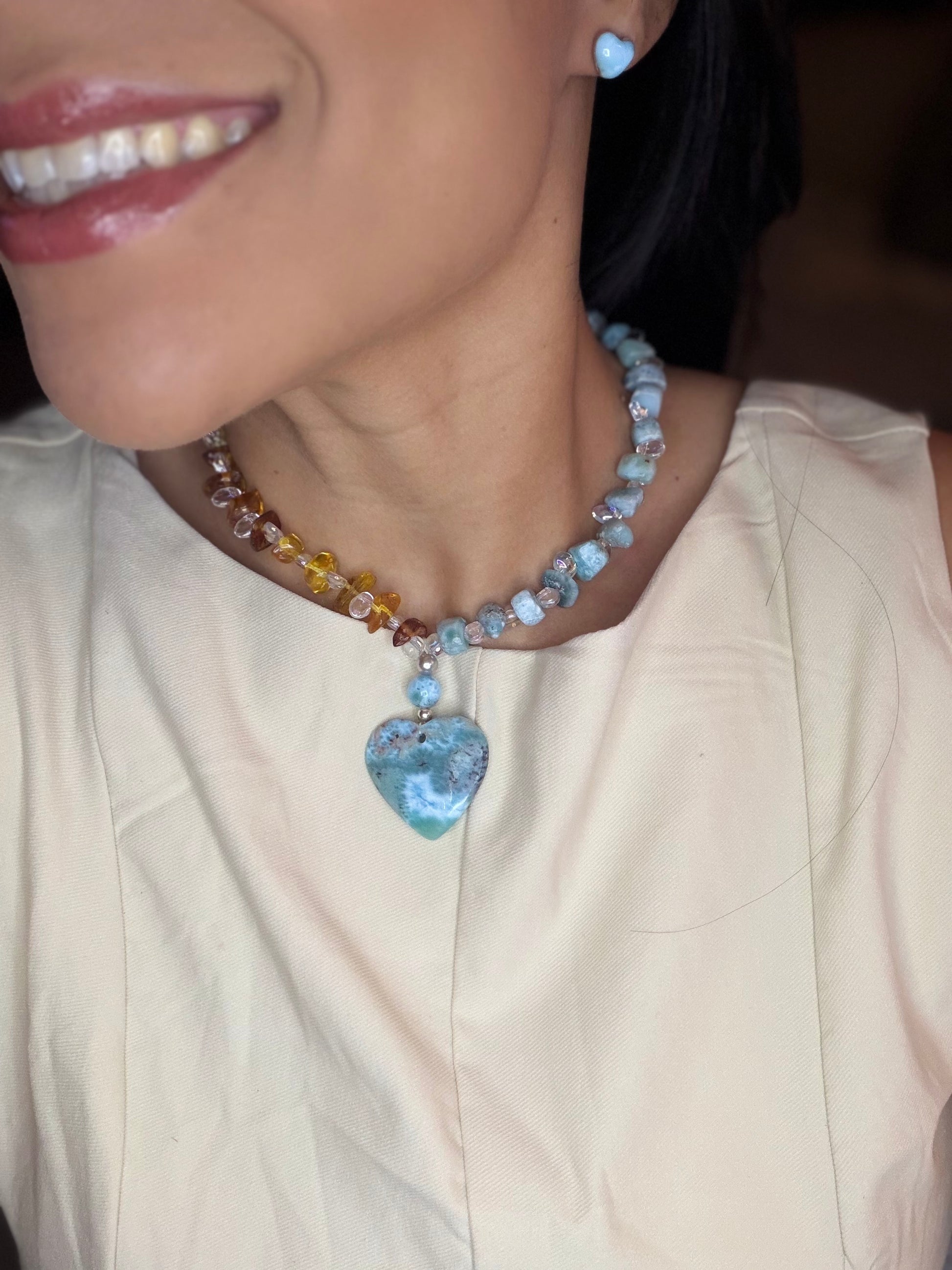 Hermoso choker de larimar y ambar con cristales transparentes adecuado para todo tipo de ocasion, para darte un toque especial y autentico, detalles en acero inoxidable de la mas alta calidad