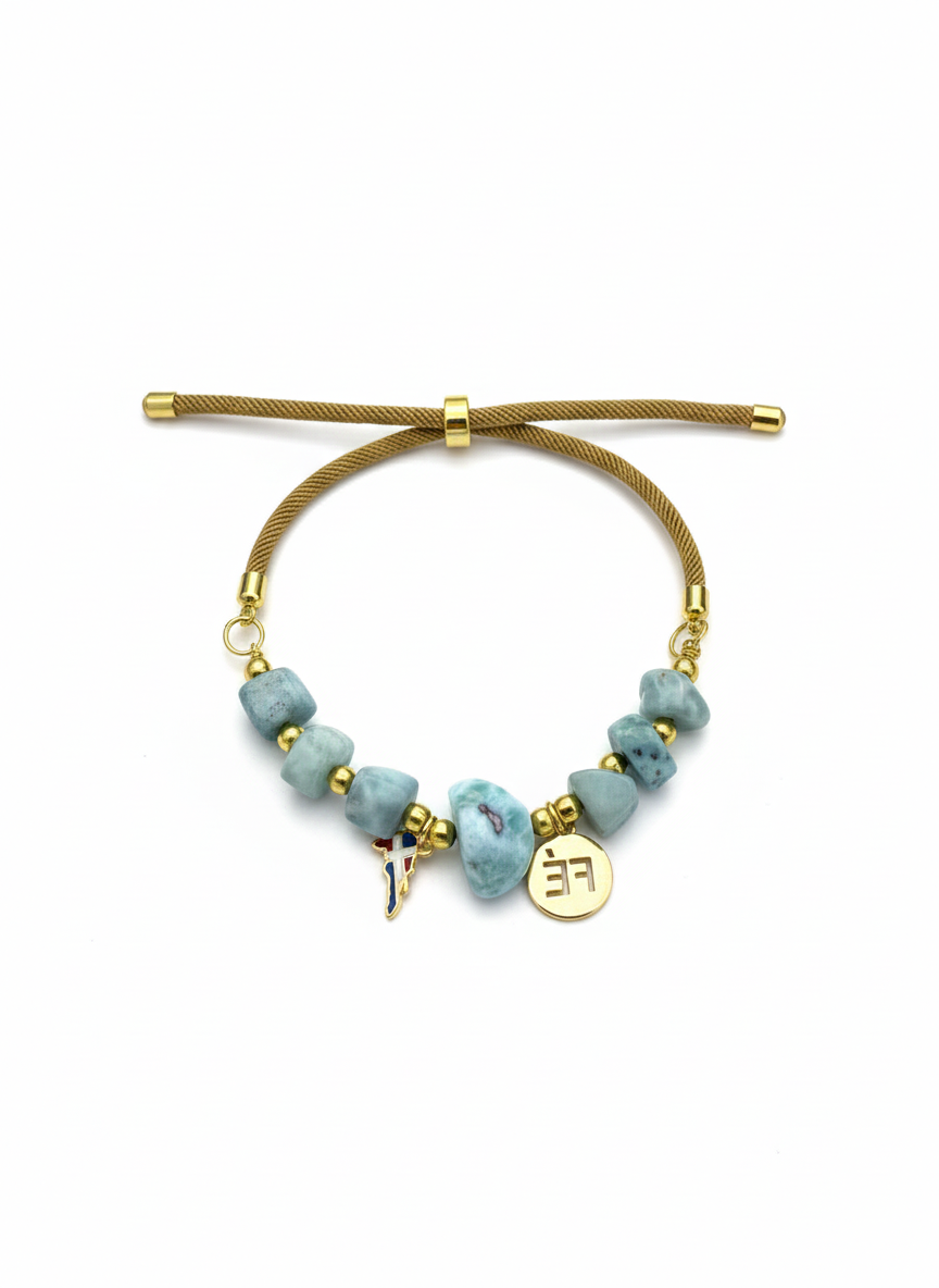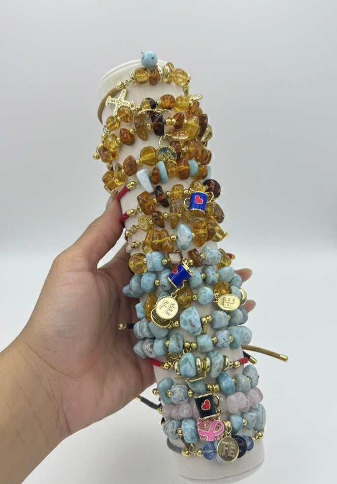 Hermosas pulsera hechas a mano con ambar y larimar dije de Fè enchapado en oro 18k, disponibles en diferentes colores
