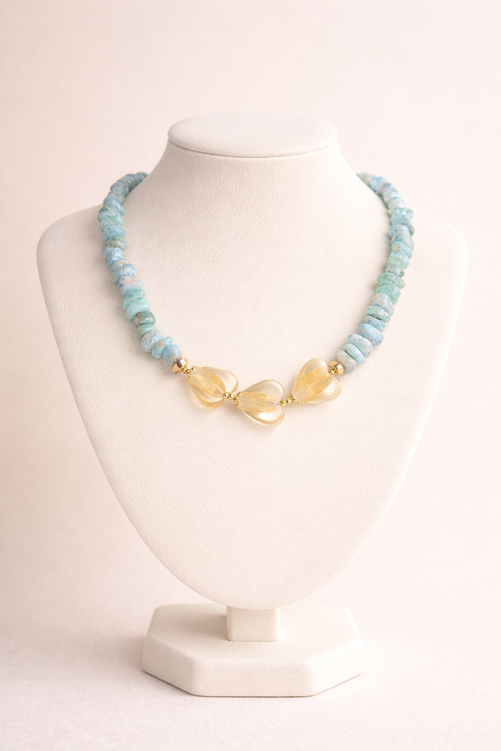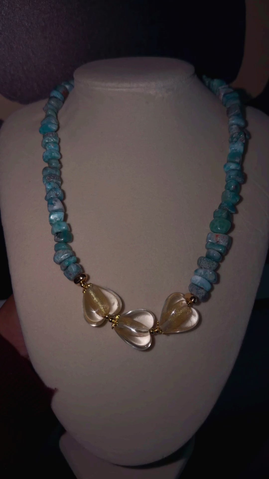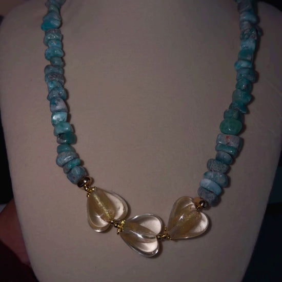 Inspirado en una poesia de amor, hermoso collar con un corazon en cristal, chips de larimar, y detalles de acero inoxidable 304 chapados en oro 18k 🩵🩵🩵